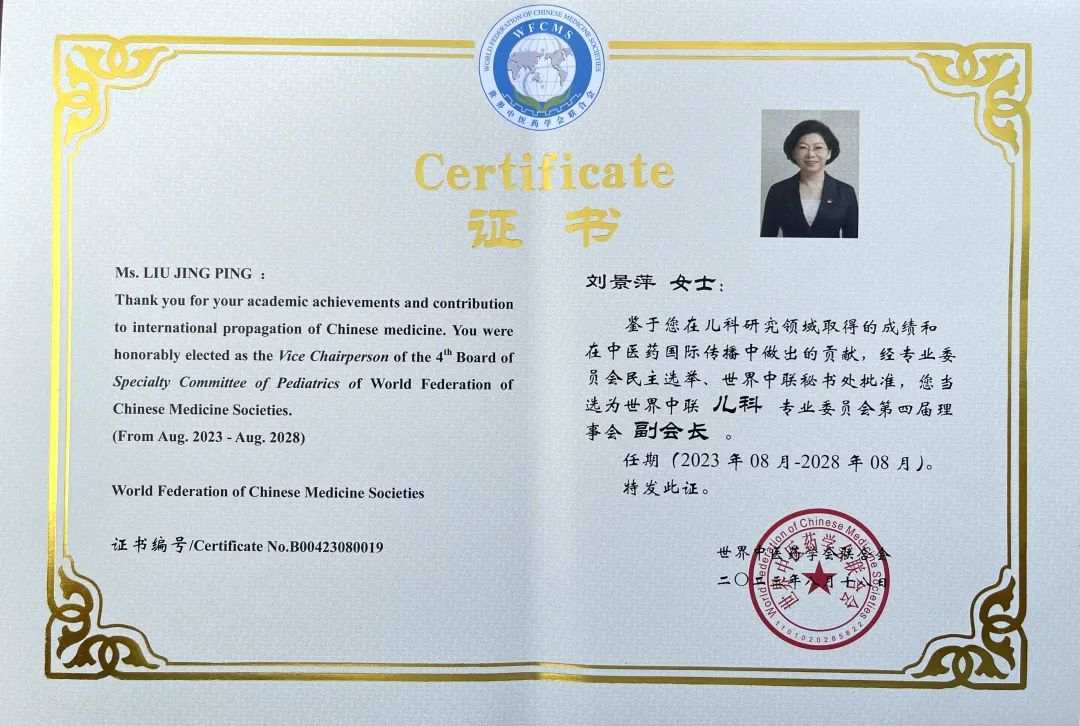 尊龙卡Z6药业集团党委书记、董事长刘景萍当选世界中医药学会联合会儿科专业委员会第四届理事会副会长